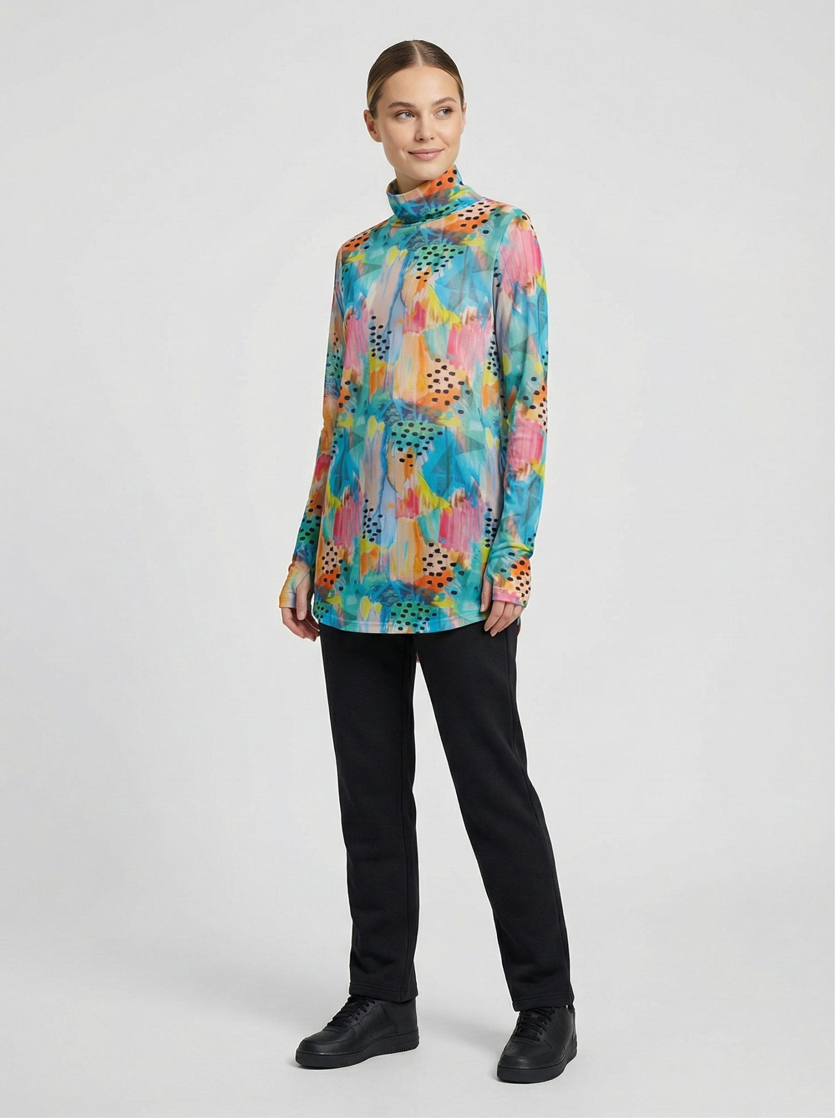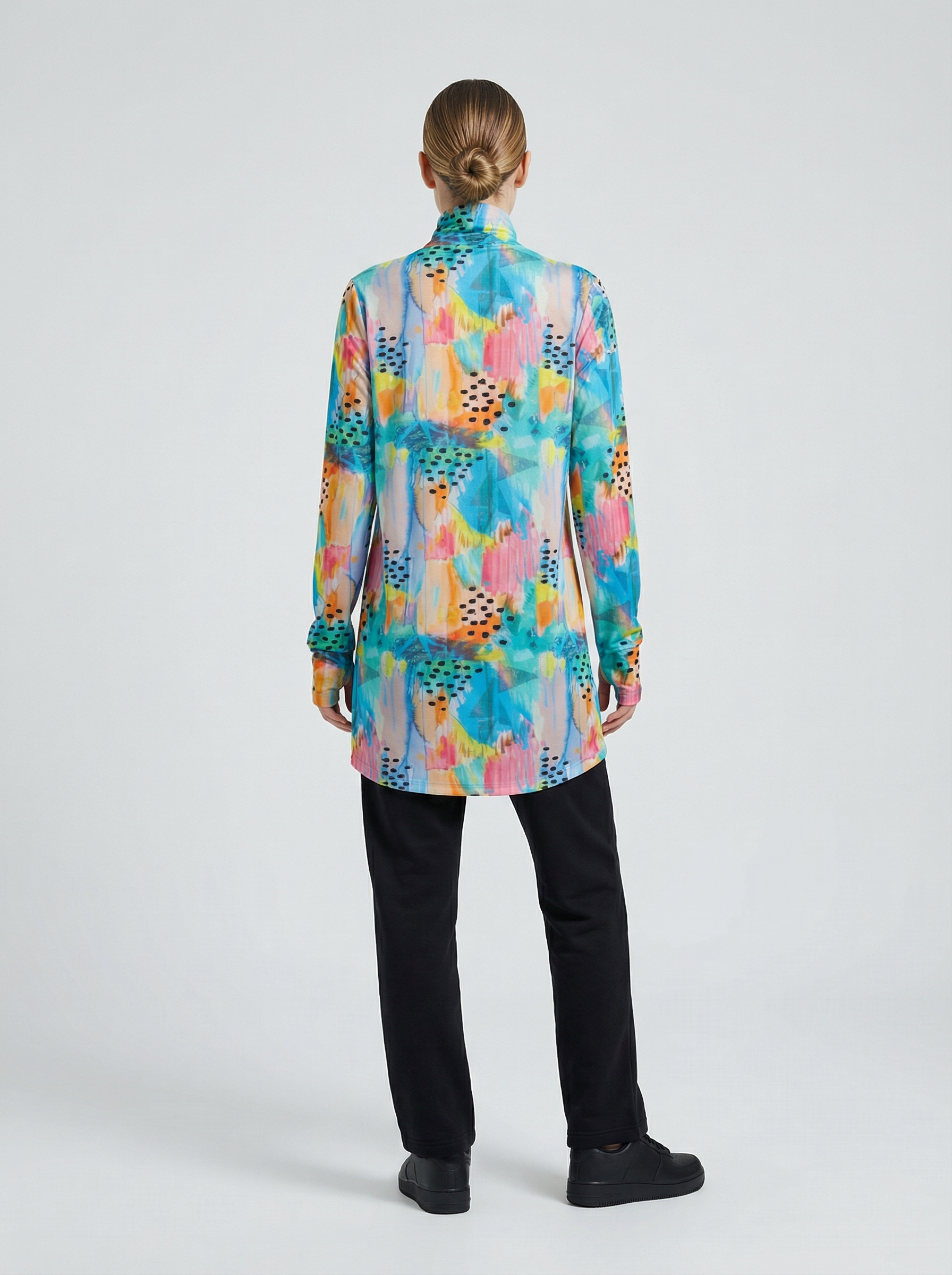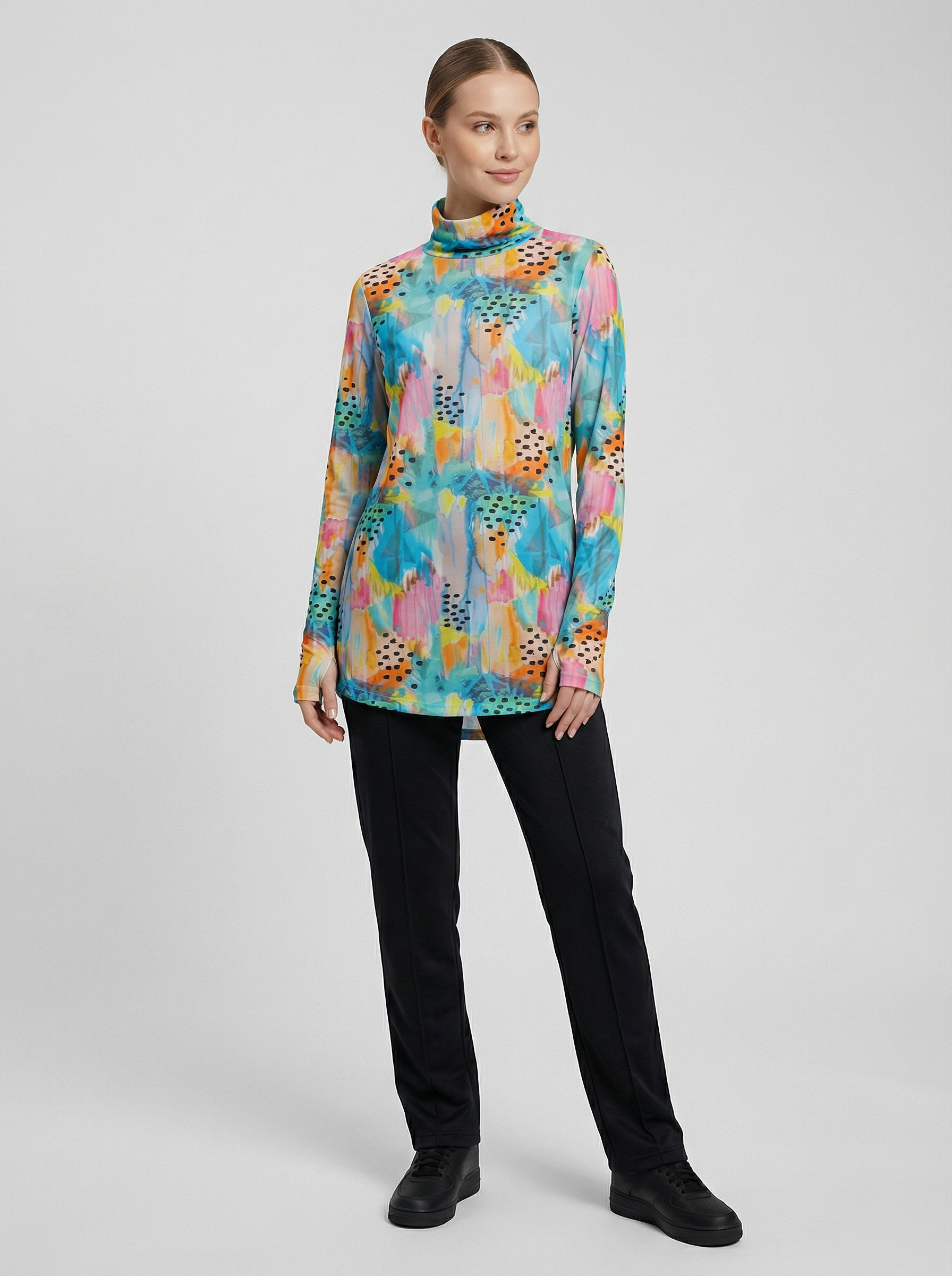 Düz kesimi, her vücut tipine uyum sağlayarak her koşulda rahat bir giyim deneyimi sunar. Arka modelin uzunluğu, özellikle eğilme veya esneme hareketleri sırasında ekstra örtücülük sağlayarak sırt ve bel bölgesinin kapalı kalmasına yardımcı olur, bu sayede rahat bir spor deneyimi sunar. Balıkçı yaka detayı ile boyun bölgesinde ekstra koruma sağlarken ayrıcaboyun hareketlerinizi daha rahat yapmanıza olanak tanır. Aynı zamanda boyun kaslarını destekleyerek spor sırasında daha iyi performans göstermenize yardımcı olur.