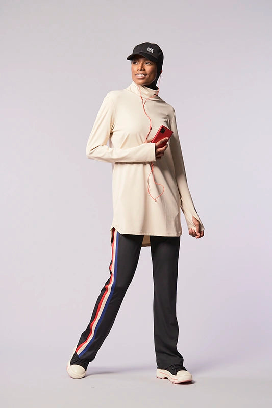 Düz kesimi, her vücut tipine uyum sağlayarak her koşulda rahat bir giyim deneyimi sunar. Arka modelin uzunluğu, özellikle eğilme veya esneme hareketleri sırasında ekstra örtücülük sağlayarak sırt ve bel bölgesinin kapalı kalmasına yardımcı olur, bu sayede rahat bir spor deneyimi sunar. Balıkçı yaka detayı ile boyun bölgesinde ekstra koruma sağlarken ayrıcaboyun hareketlerinizi daha rahat yapmanıza olanak tanır. Aynı zamanda boyun kaslarını destekleyerek spor sırasında daha iyi performans göstermenize yardımcı olur.